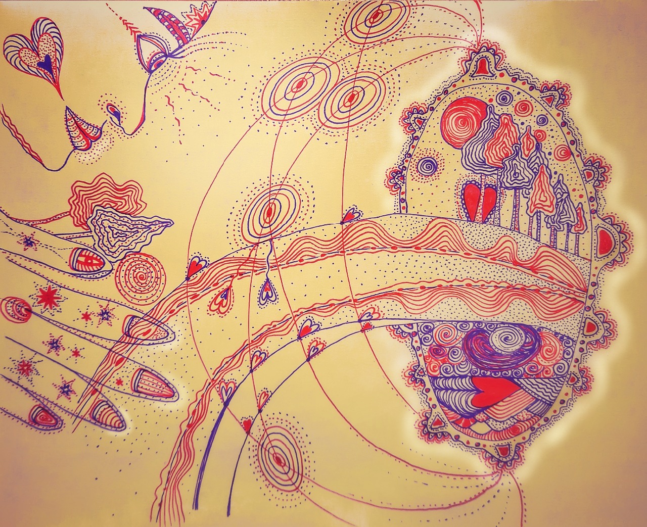 Nejdříve na otázku "Co je tedy vlastně realita?" vznikl obrázek nahoře. Velmi přínosné "vymalování se" v rámci artterapie (papír A4, gelové fixy).